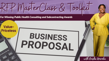 Supercharge your business growth with my one-of-a-kind "Public Heath Contracts Course Bundle". This bundle features a dynamic duo of business development courses. This bundle includes my "RFP Toolkit," a collection of RFP writing resources an,d the coveted RFP Masterclass replay. Both serve as your comprehensive guide to mastering the RFP proposal writing process. You'll also get my "Federal Contracting 101" cour,se designed to empower public health professionals in navigating the intricate landscape of federal contracts.